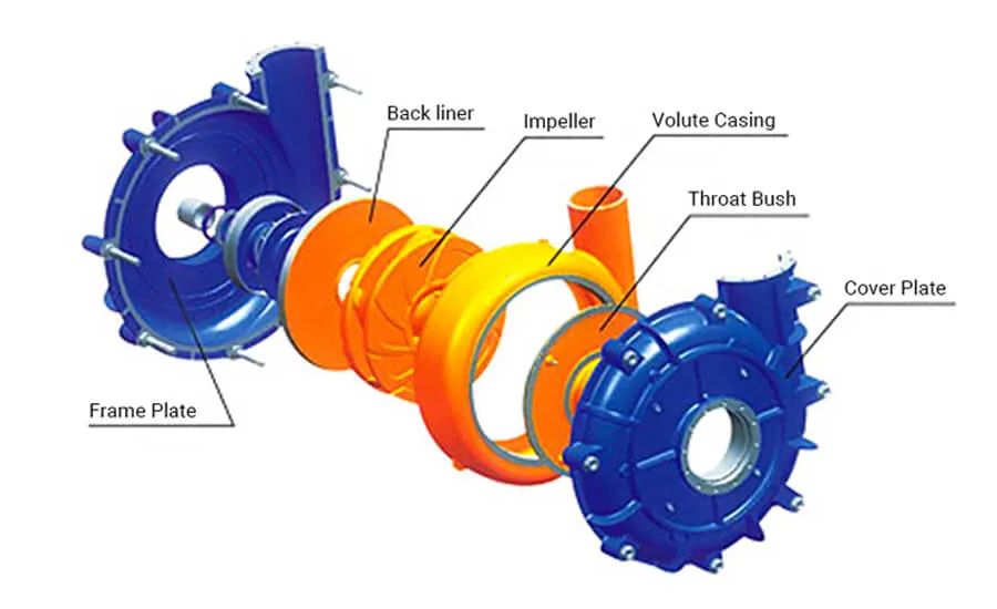 The pump casing of a slurry pump typically refers to the frame plate and cover plate of a double-casing slurry pump, both of which contain replaceable wear-resistant metal or rubber liners.